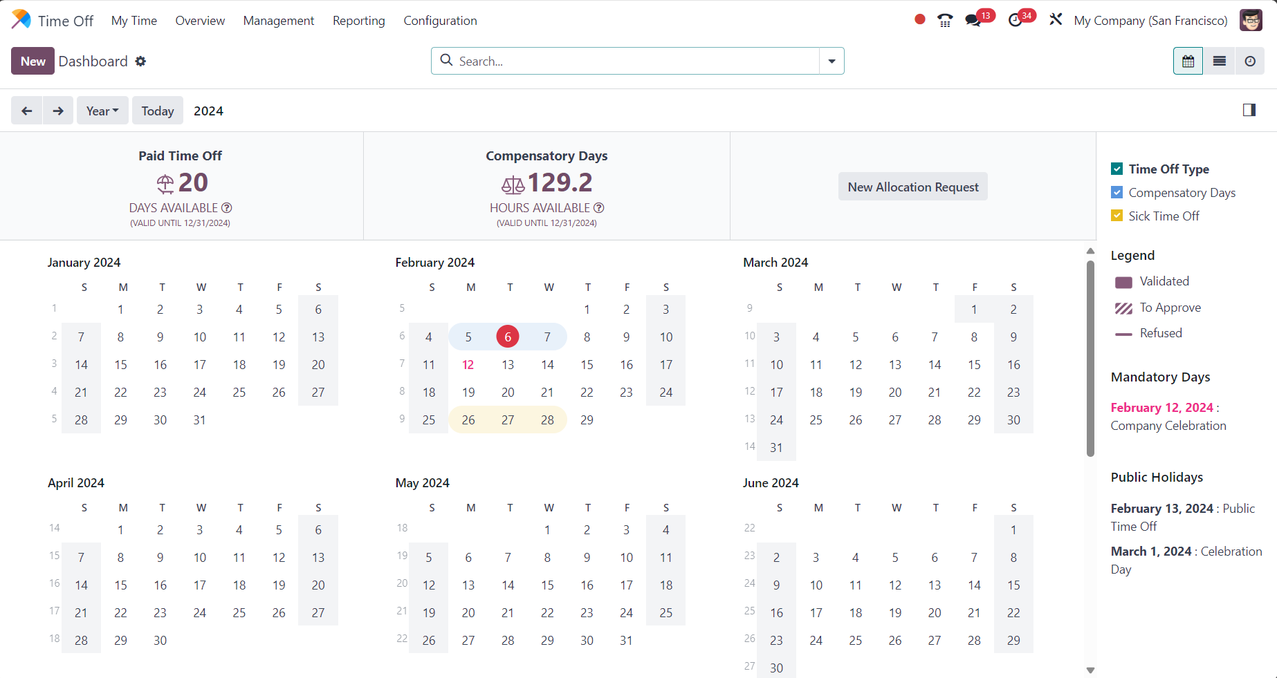 Odoo HRM hỗ trợ quản lý nhiều loại nghỉ phép khác nhau, bao gồm nghỉ phép hàng năm, nghỉ thai sản, nghỉ ốm, nghỉ không lương, và nhiều loại nghỉ phép khác. Điều này tạo ra sự linh hoạt cho cả nhân viên và quản lý.