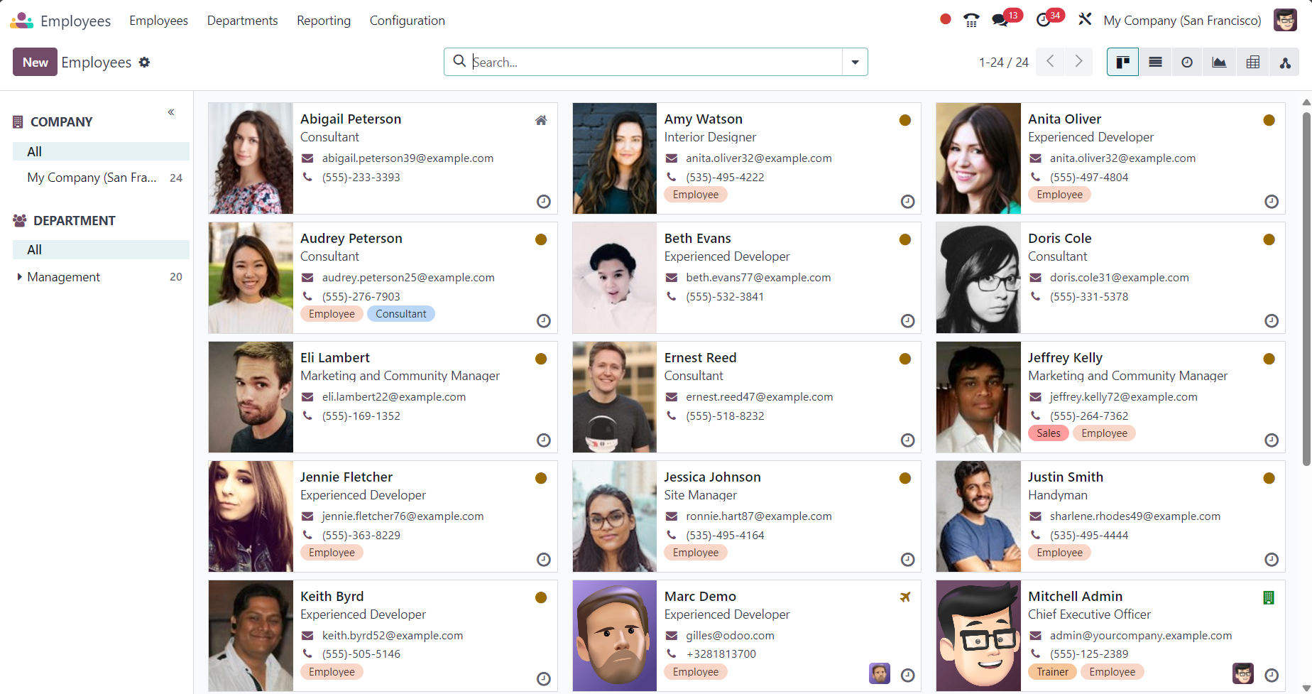Odoo HRM cung cấp các công cụ thống kê và báo cáo thông minh về các thông tin liên quan đến nhân viên. Điều này giúp quản lý đưa ra quyết định thông minh dựa trên dữ liệu đầy đủ và chính xác.