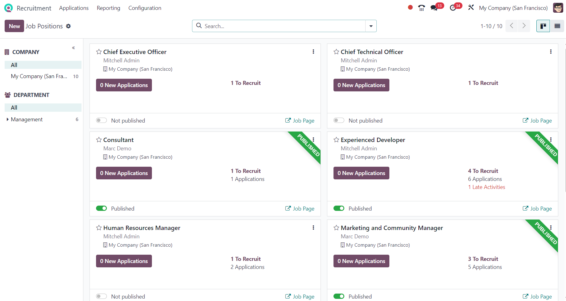 Giao diện của tính năng Tuyển dụng trong Odoo 15 HRM được thiết kế để đơn giản và dễ sử dụng. Việc quản lý tất cả các bước từ đăng tin tuyển dụng đến chọn lựa ứng viên đều trở nên thuận tiện và hiệu quả.