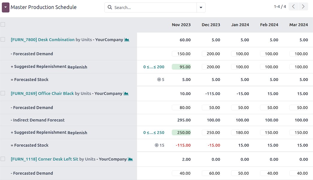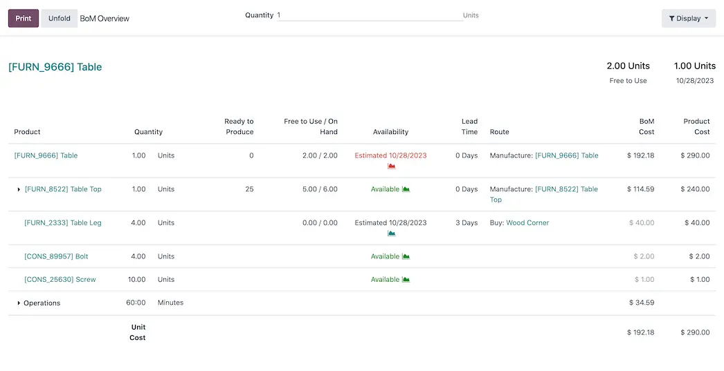 Giúp bạn dễ dàng lên Kế hoạch sản xuất với thông tin về công suất, tồn kho nguyên liệu và chi phí. Cùng đó, bạn sẽ nhận được những đề xuất bổ sung kịp thời và lựa chọn linh hoạt về cách bổ sung thành phần: Sản xuất, mua, ký hợp đồng phụ, hoặc lấy từ kho khác.