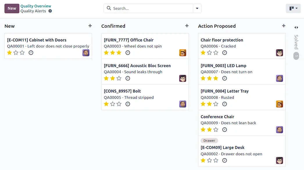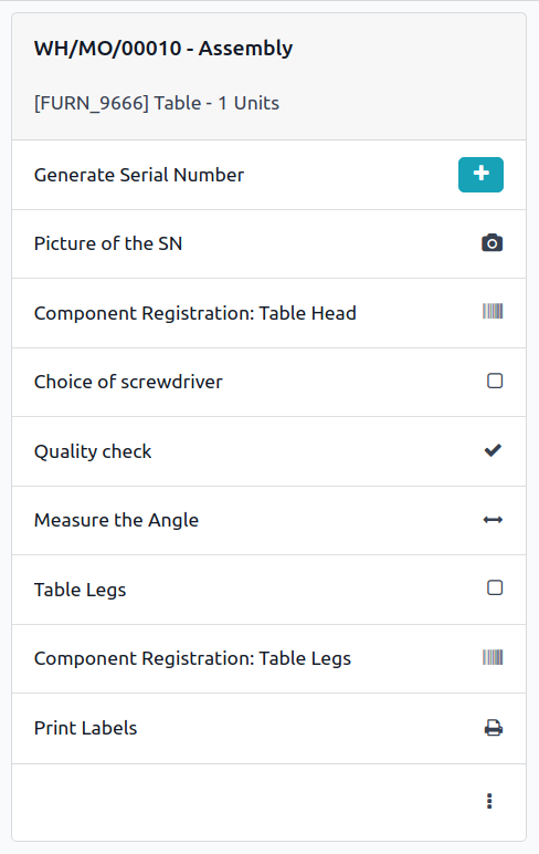 Với sự hỗ trợ của Odoo MES được tối ưu hóa cho máy tính bảng, trang tổng quan giúp bạn hiệu quả hóa dây chuyền sản xuất bằng cách sắp xếp nhân công, khu vực làm việc, bảng công tác, kiểm tra chất lượng, và nhiều khía cạnh khác.
